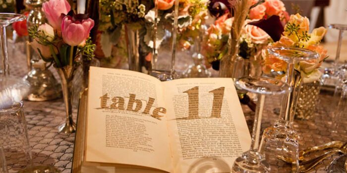Comenzamos con una idea tan sencilla como memorable, con estos bonitos libros que además de crear un ambiente muy especial, sirven para enumerar las mesas.